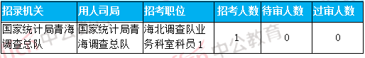 截至到7日16時(shí),工作地點(diǎn)在青海的職位只有1個(gè)無(wú)人報(bào)考,共招錄1人。用人司局是國(guó)家統(tǒng)計(jì)局青海調(diào)查總隊(duì),招錄1人,現(xiàn)還沒(méi)有人報(bào)名和通過(guò)審核。