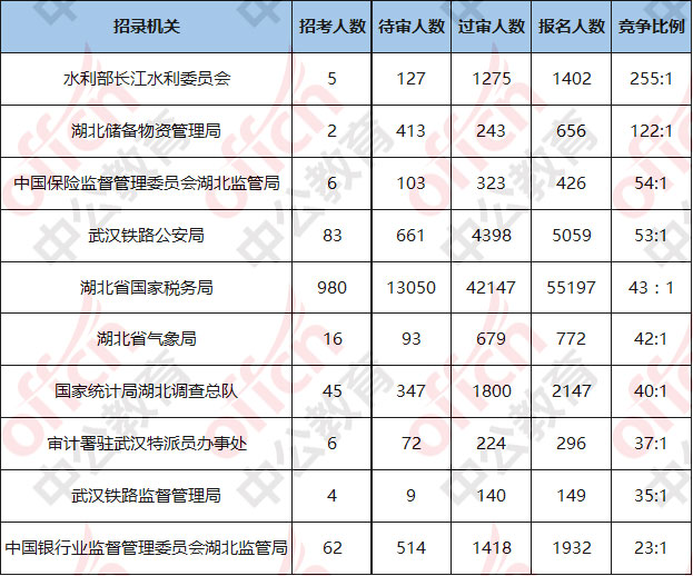 為幫助廣大考生更清晰的了解今日報名情況,中公網(wǎng)校整理了11月7日報名審核通過人數(shù)前十位的部門以及競爭比例最激烈的十大部門,供廣大考生參考: