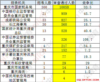 截止到7日16時,通過審核人數(shù)前三位的部門依次還是:重慶市國家稅務局、中國銀行業(yè)監(jiān)督管理委員會重慶監(jiān)管局、成都鐵路公安局,三部門通過審核總人數(shù)達11844人,占通過審核總人數(shù)的86.1%。