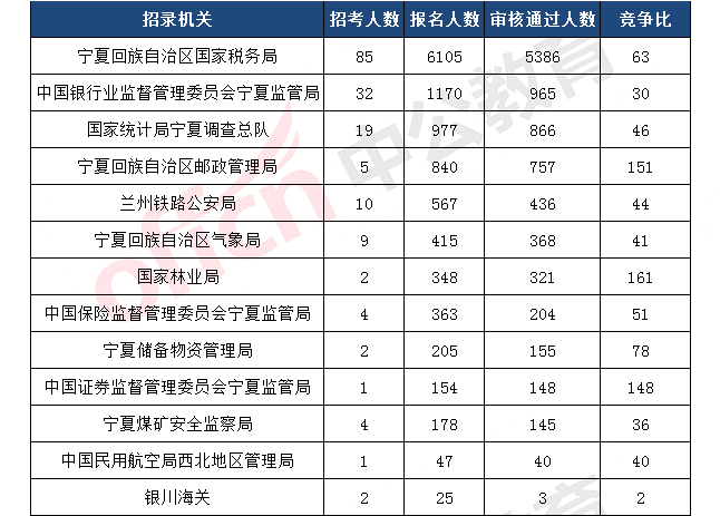 截止到11月8日9時,報名通過審核人數(shù)前十的職位主要為寧夏回族自治區(qū)國家稅務(wù)局、寧夏回族自治區(qū)郵政管理局,具體信息如下: