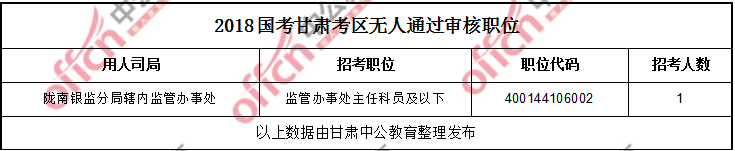 11月8日16時,工作地點在甘肅的職位共有1個職位無人通過審核,占全部職位的0.5%,1個職位無人報考,占全部職位的0.5%。下面是無人待審及無人報報職位一覽表,中公網(wǎng)校專家建議廣大考生多關(guān)注一些較冷職位,避免激烈競爭,結(jié)合自身條件,找到屬于自己的職位。
