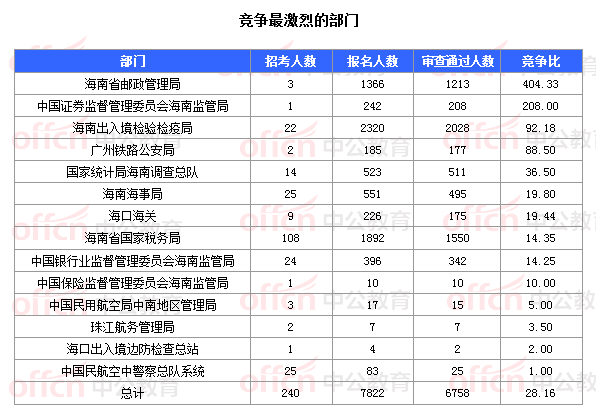 截止到8日16時(shí),通過審核人數(shù)前三位的部門依次是:海南出入境檢驗(yàn)檢疫局海南省國(guó)家稅務(wù)局、海南省郵政管理局、,三部門通過審核總?cè)藬?shù)達(dá)4791人,占通過審核總?cè)藬?shù)的70.09%。