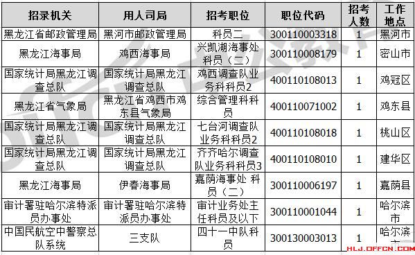 報(bào)名通過審核人數(shù)前十的職位主要集中在黑龍江省國家稅務(wù)局、哈爾濱鐵路公安局、黑龍江省郵政管理局等部門,具體信息如下: