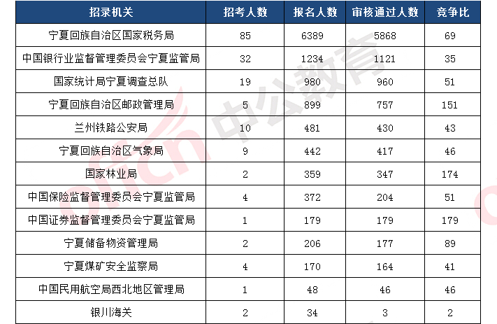 截止到11月8日17時(shí)30分,報(bào)名通過審核人數(shù)前十的職位主要為寧夏回族自治區(qū)國家稅務(wù)局、寧夏回族自治區(qū)郵政管理局,具體信息如下: