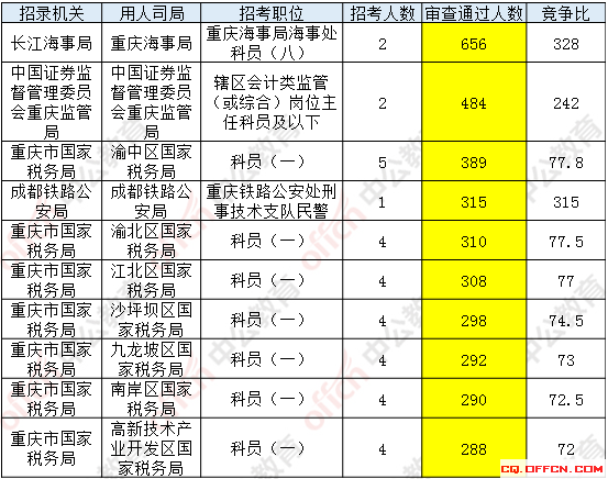 報名通過審核人數(shù)前十的職位主要集中在長江海事局、中國證券監(jiān)督管理委員會重慶監(jiān)管局、重慶市國家稅務局、成都鐵路公安局四個部門。報名通過審核人數(shù)最多的職位亦是競爭比例的職位。報名通過人數(shù)位居第二的中國證券監(jiān)督管理委員會重慶監(jiān)管局的職位主要是從事從事轄區(qū)會計類監(jiān)管或內(nèi)部綜合管理等工作,為特殊專業(yè)職位(證監(jiān)法律類)職位,共兩個職位,且皆不限政治面貌、基層工作最低年限、服務基層項目工作經(jīng)歷。而重慶市國家稅務局的職位最熱崗位的政治面貌、基層工作最低年限、服務基層項目工作經(jīng)歷皆不限。主要招錄2016年及以后年度畢業(yè)的高校畢業(yè)生,女性,在本單位最低服務年限為5年的考生。