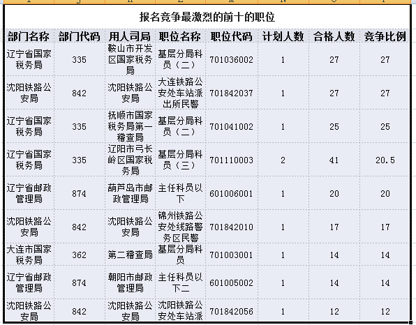 截至16日早8時(shí),招錄比例的職位為遼陽市弓長嶺區(qū)國家稅務(wù)局基層分局科員(三)一職,招錄2人,通過人數(shù)為41人。報(bào)名通過審核人數(shù)前十的職位主要集中在遼寧省國稅局、沈陽鐵路公安局、大連市國稅局,具體信息如下: