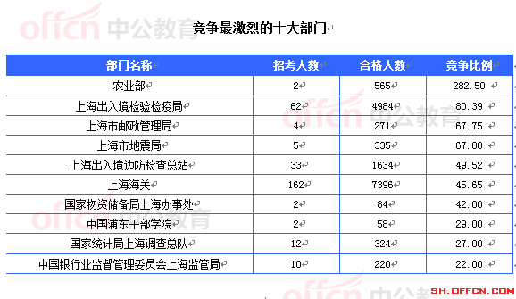10月20日16時,2015國家公務(wù)員考試報名進入第6天。據(jù)中公教育統(tǒng)計,國考職位中工作崗位在上海的職位通過審核的總?cè)藬?shù)為19453人,共有13個職位無人通過審核,平均競爭比例為30.3:1??忌枳⒁膺@并不是最終的報名人數(shù),審核時間是截至2014年10月26日18:00。