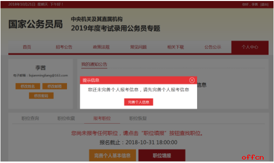 中公教育專家提醒考生,點(diǎn)擊“完善個(gè)人信息”之后就要進(jìn)入全面填寫(xiě)信息頁(yè)面,考生們此時(shí)可將相關(guān)的證件準(zhǔn)備出來(lái),以便填寫(xiě)時(shí)準(zhǔn)確輸入,頁(yè)面詳情如下: