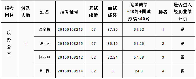 根據(jù)《怒江州2015年州級(jí)機(jī)關(guān)公開(kāi)遴選公務(wù)員和參照公務(wù)員法管理單位工作人員公告》要求,面試由遴選單位負(fù)責(zé)實(shí)施,現(xiàn)將怒江州人民檢察院公開(kāi)遴選公務(wù)員面試成績(jī)及進(jìn)入業(yè)績(jī)?cè)u(píng)價(jià)人員名單公告如下: