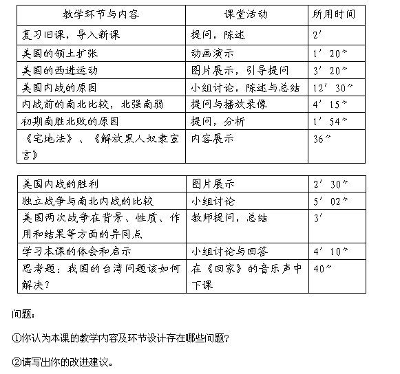 (2)下面是某教師關(guān)于美國(guó)內(nèi)戰(zhàn)一課的教學(xué)過程描述表。