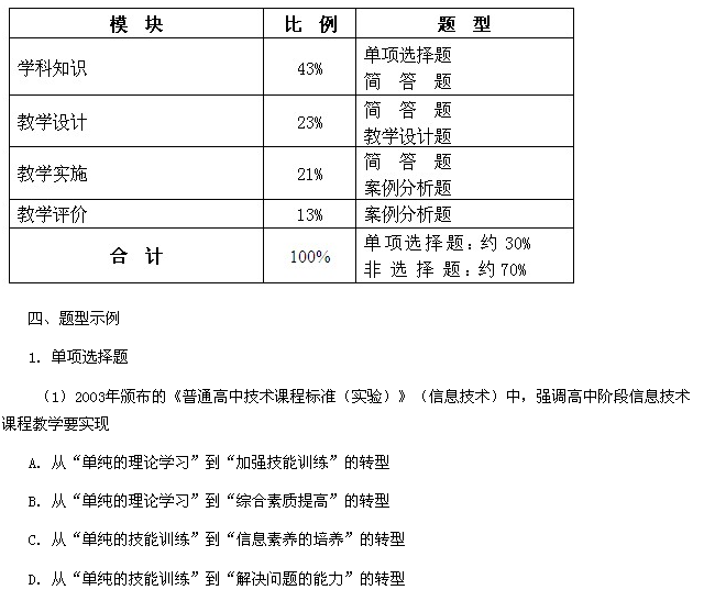 1.信息技術(shù)學科知識運用能力。了解信息技術(shù)發(fā)展的歷史和現(xiàn)狀,把握國內(nèi)外信息技術(shù) 發(fā)展動態(tài);掌握信息技術(shù)學科基本知識與技能,熟悉信息技術(shù)學科的特征與應(yīng)用領(lǐng)域;掌握信息技術(shù)學科教學的基本理論和方法,并能在信息技術(shù)學科教學中靈活運 用;理解《普通高中技術(shù)課程標準(實驗)》(信息技術(shù))規(guī)定的課程目標、教學內(nèi)容和實施建議,用以開展學科教學和指導(dǎo)學生實訓實踐。