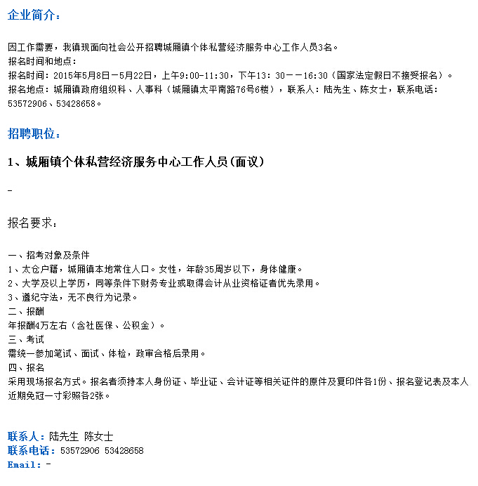 2015年江蘇省太倉(cāng)市城廂鎮(zhèn)人民政府個(gè)體私營(yíng)經(jīng)濟(jì)服務(wù)中心招聘公告【招3人】