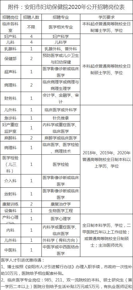 普通高等院校全日制本科以上學歷畢業(yè)生和專業(yè)技術(shù)人員。招聘崗位、條件及人數(shù)見《安陽市婦幼保健院2020年公開招聘崗位表》(詳見附件)