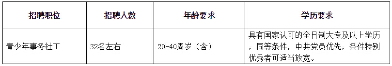 根據(jù)加強(qiáng)青少年事務(wù)社會(huì)工作專業(yè)人才隊(duì)伍建設(shè),服務(wù)青少年健康成長(zhǎng),發(fā)展青少年社會(huì)事業(yè)工作需要,按照“公開、公平、公正”和“競(jìng)爭(zhēng)擇優(yōu)”的原則,在共青團(tuán)上海市嘉定區(qū)委員會(huì)的指導(dǎo)下,上海市嘉園社區(qū)青少年事務(wù)中心面向社會(huì)公開招聘社會(huì)工作者(簡(jiǎn)稱“社工”),現(xiàn)將招聘啟事公布如下: