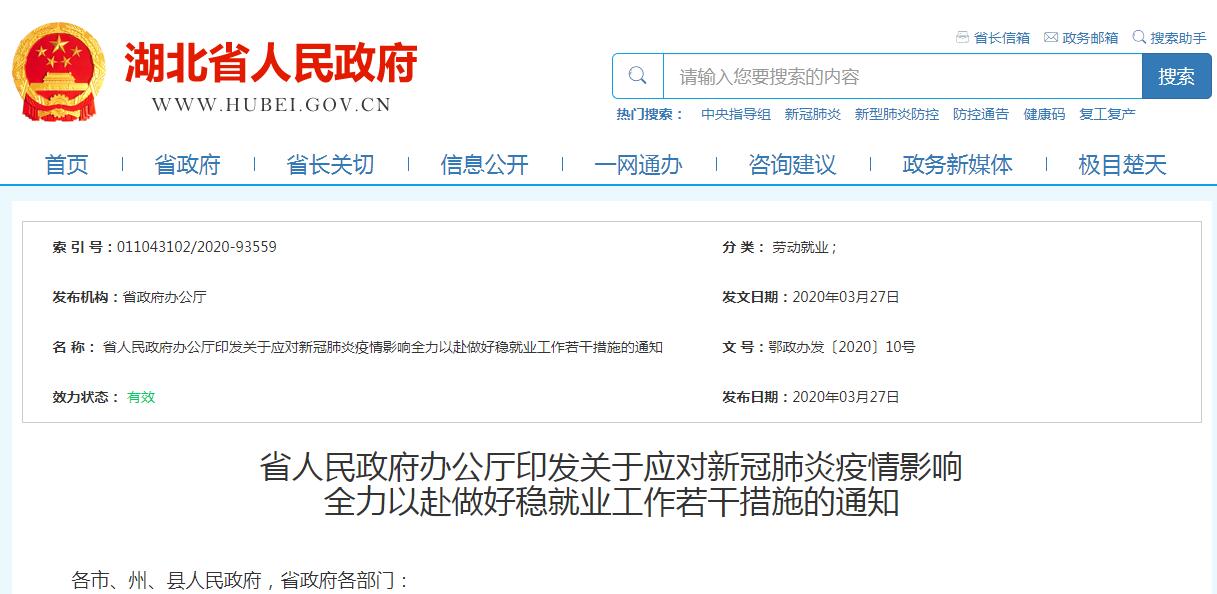 3月27日,湖北省政府辦公廳印發(fā)《關(guān)于應(yīng)對新冠肺炎疫情影響全力以赴做好穩(wěn)就業(yè)工作的若干措施》,圍繞全力推動安全有序復(fù)工返崗、支持企業(yè)減負(fù)穩(wěn)崗、促進多渠道就業(yè)、促進高校畢業(yè)生就業(yè)、推進創(chuàng)業(yè)帶就業(yè)、實施就業(yè)扶貧、做好困難人員兜底、做實職業(yè)培訓(xùn)和就業(yè)服務(wù)、加強組織等9個方面,共計25條具體措施。