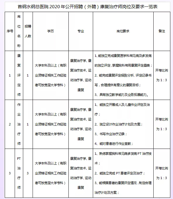 為進一步推動首鋼水鋼總醫(yī)院康復醫(yī)學科建設,更好服務患者,因業(yè)務發(fā)展需要,決定面向社會公開招聘康復工作人員5名,現將招聘事項公告如下: