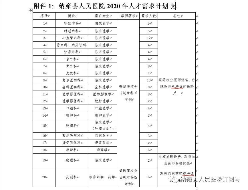 普通高校全日制本科及以上學(xué)歷畢業(yè)生100人。具體崗位詳見《納雍縣人民醫(yī)院2020年人才需求計(jì)劃表》。