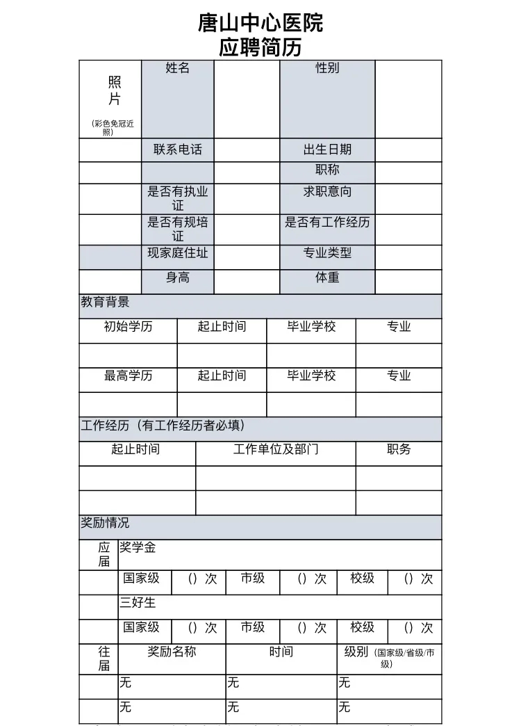 1.應(yīng)聘簡歷:關(guān)注微信公眾號(唐山中心醫(yī)院),下載應(yīng)聘簡歷模板,按要求填寫。