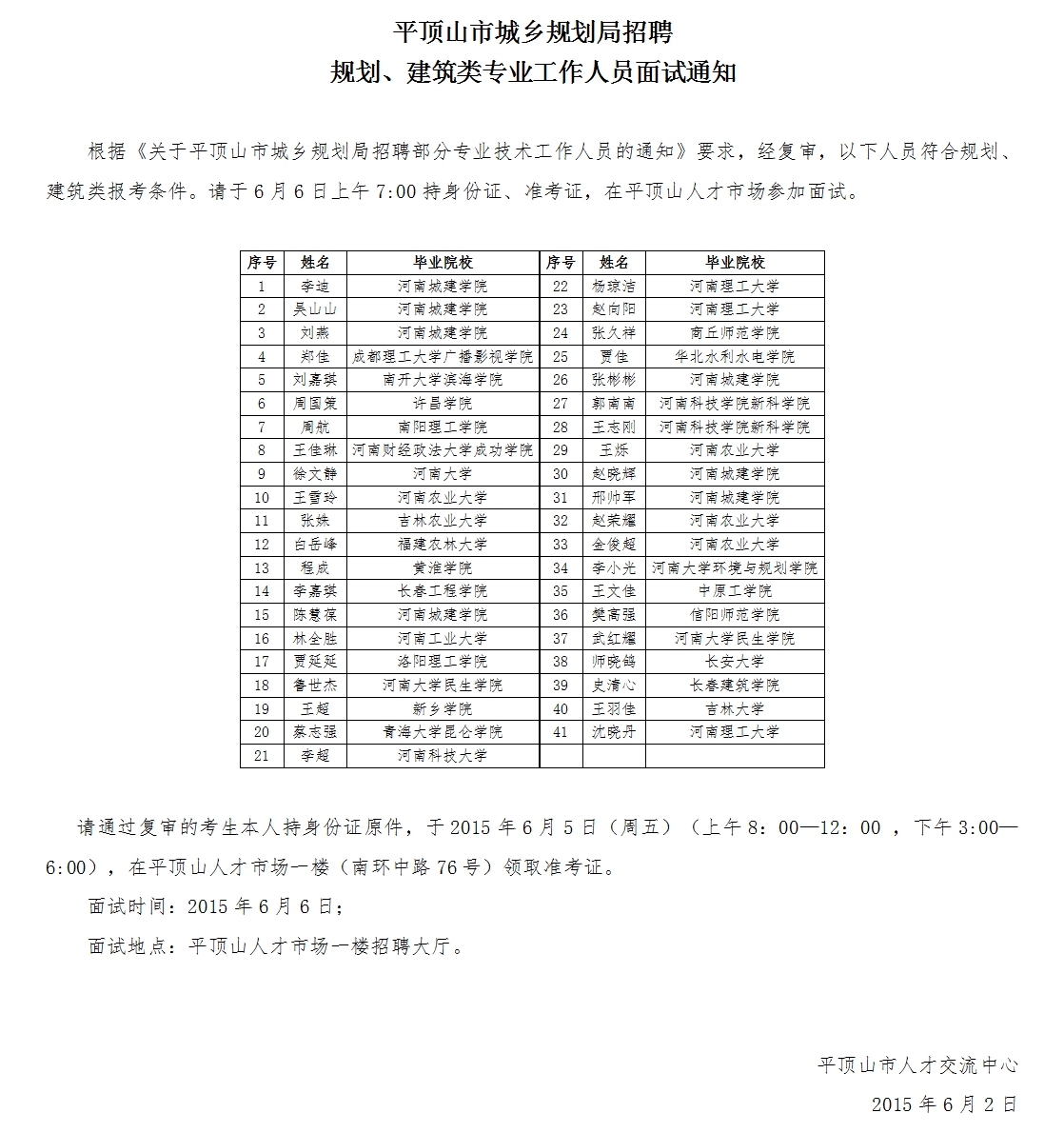 2015河南平頂山市城鄉(xiāng)規(guī)劃局招聘規(guī)劃、建筑類專業(yè)人員面試通知