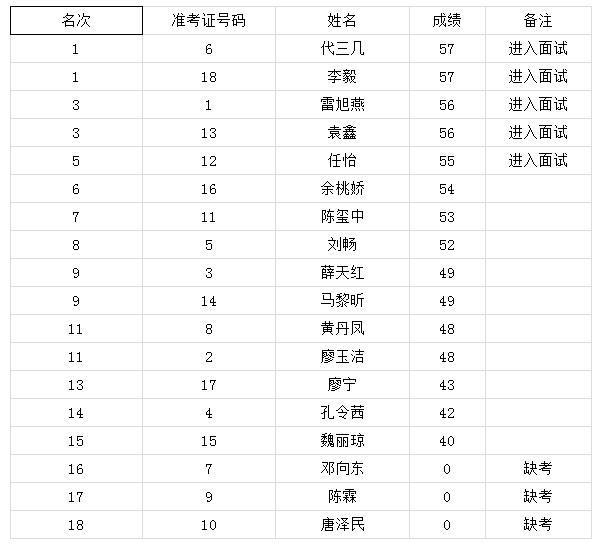 根據(jù)中共雅安市委組織部、雅安市人力資源和社會(huì)局《關(guān)于雅安市2015年公開考核招聘事業(yè)單位高學(xué)歷和急需專業(yè)人員的公告》相關(guān)規(guī)定,我局組織的筆試工作已經(jīng)結(jié)束。現(xiàn)將筆試成績(jī)及進(jìn)入面試人員名單公示如下,具體面試時(shí)間另行電話通知。
