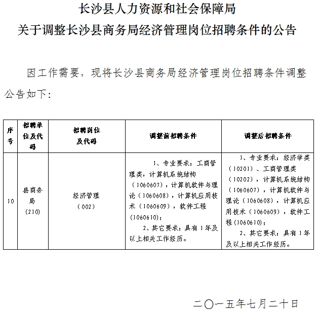 2015湖南長沙縣商務局經(jīng)濟管理崗位招聘條件調(diào)整公告
