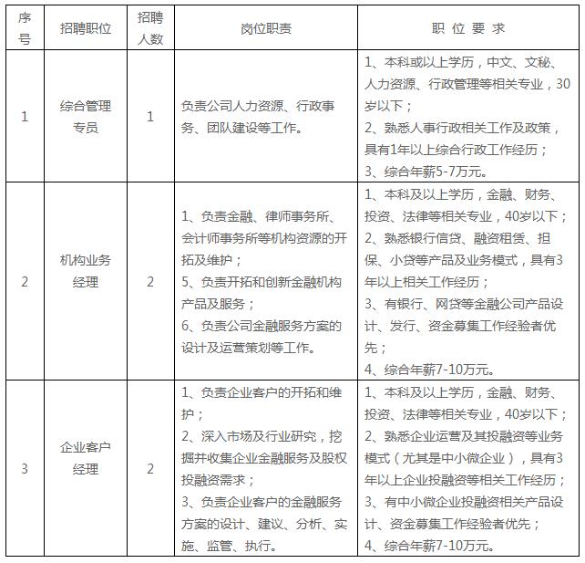 公司秉承簡潔務(wù)實、無我有為、創(chuàng)新高效的園區(qū)精神,力求促進園區(qū)經(jīng)濟社會協(xié)調(diào)發(fā)展。為進一步推進金融服務(wù)中心的工作穩(wěn)步有序開展,公司將搭建互聯(lián)網(wǎng)平臺,多渠道、多層次的引導(dǎo)更多的社會資本投入到經(jīng)濟開發(fā)區(qū)的企業(yè)中,促進銀企合作,開拓眾籌、P2P等新業(yè)務(wù)模式,公司決定公開招聘工作人員5名。具體如下: