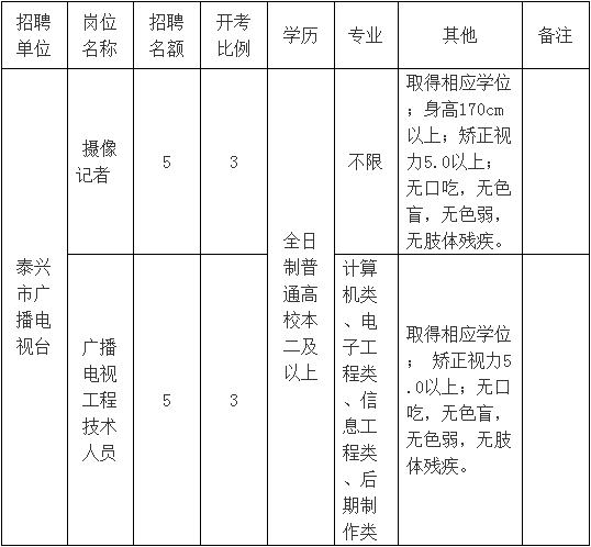 因工作需要,泰興市廣播電視臺(tái)面向社會(huì)公開(kāi)招聘工作人員?,F(xiàn)將有關(guān)招聘事項(xiàng)公布如下: