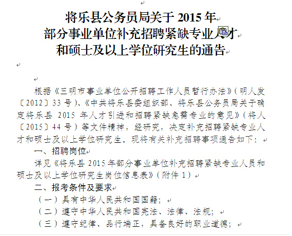 2015福建將樂縣事業(yè)單位補充招聘緊缺專業(yè)人才和碩士及以上學位研究生公告【招35人】