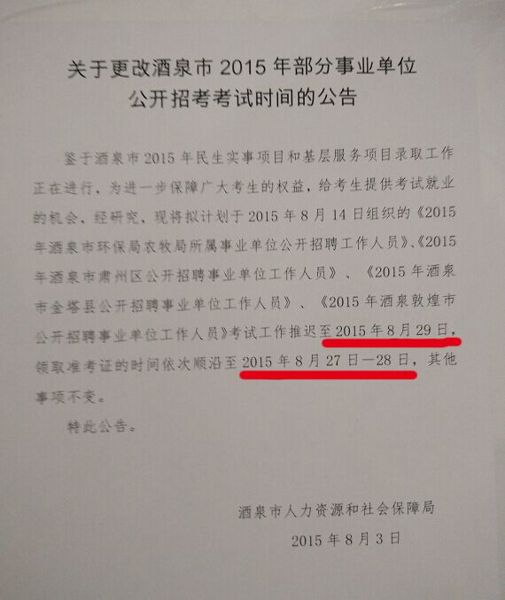 2015甘肅酒泉市事業(yè)單位招聘考試時間更改公告