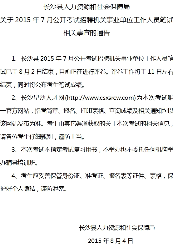 2015年7月湖南長沙考試招聘機(jī)關(guān)事業(yè)單位筆試相關(guān)通告