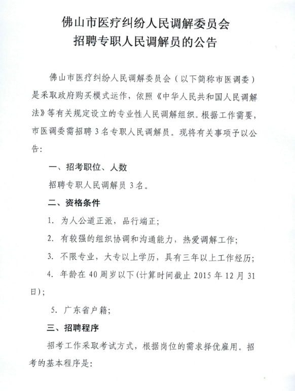 2015廣東佛山市醫(yī)療糾紛人民調(diào)解委員會招聘專職人民調(diào)解員3人公告
