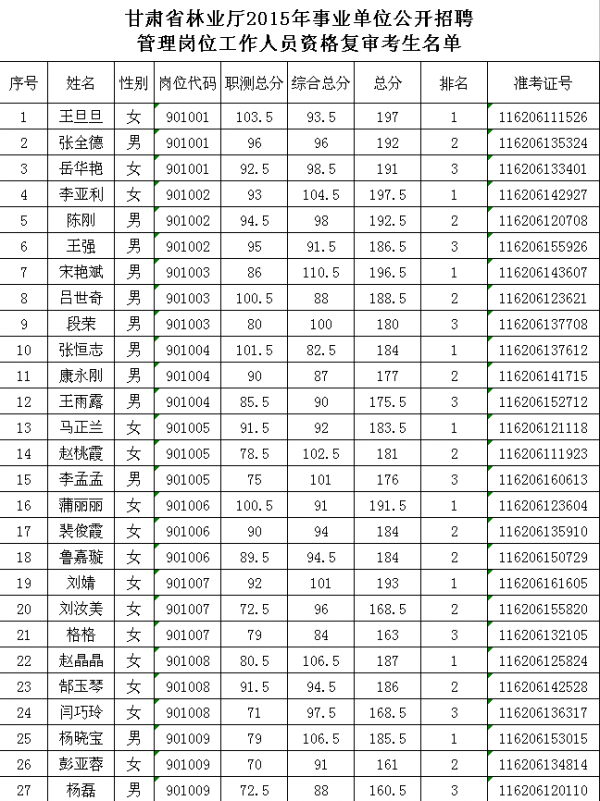 甘肅省林業(yè)廳2015年事業(yè)單位公開招聘管理崗位工作人員(省直第九期)筆試工作已經(jīng)結(jié)束,現(xiàn)就資格復(fù)審有關(guān)事項通知如下: