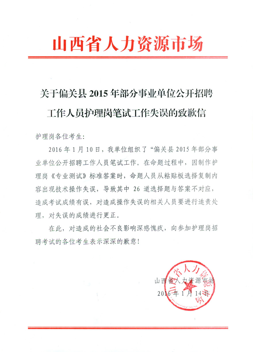 2015山西偏關(guān)縣事業(yè)單位招聘護(hù)理崗位筆試工作失誤的致歉信