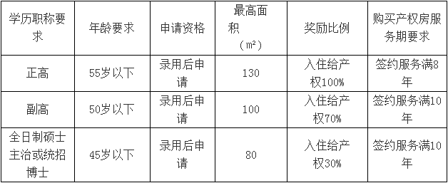 醫(yī)院內(nèi)產(chǎn)權(quán)房。全日制碩士主治或統(tǒng)招博士學(xué)歷學(xué)位、副高職稱、正高職稱人員(招聘引進(jìn)的轄區(qū)內(nèi)人員除外)均有資格按市場價(jià)申請(qǐng)購買產(chǎn)權(quán)房,市政府按市場價(jià)給予適當(dāng)獎(jiǎng)勵(lì),稅費(fèi)自理。具體獎(jiǎng)勵(lì)對(duì)象、要求和標(biāo)準(zhǔn)如下: