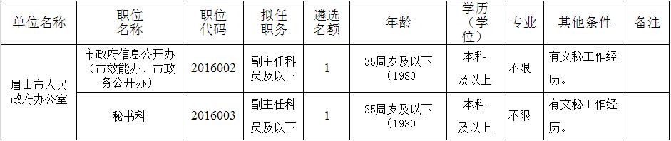 7.其他條件見《眉山市市級(jí)機(jī)關(guān)面向基層公開遴選公務(wù)員職位表》(附件1)。