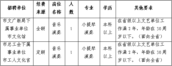 根據(jù)市文廣新局、市總工會(huì)申報(bào)需求,經(jīng)審核,面向社會(huì)公開(kāi)招聘音樂(lè)演奏(小提琴演奏)人員共計(jì)2人(具體計(jì)劃詳見(jiàn)下表)。