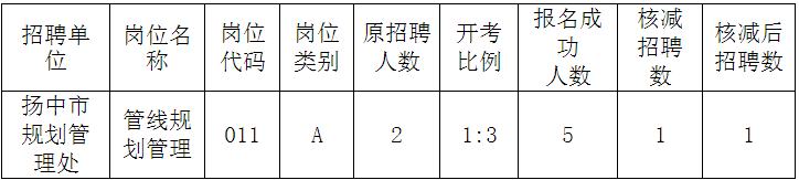 根據(jù)《揚中市事業(yè)單位2016年公開招聘工作人員公告》(鎮(zhèn)揚人社事招公告〔2016〕1號),揚中市規(guī)劃管理處的管線規(guī)劃管理崗位因報名人數(shù)不足,予以核減,具體如下表: