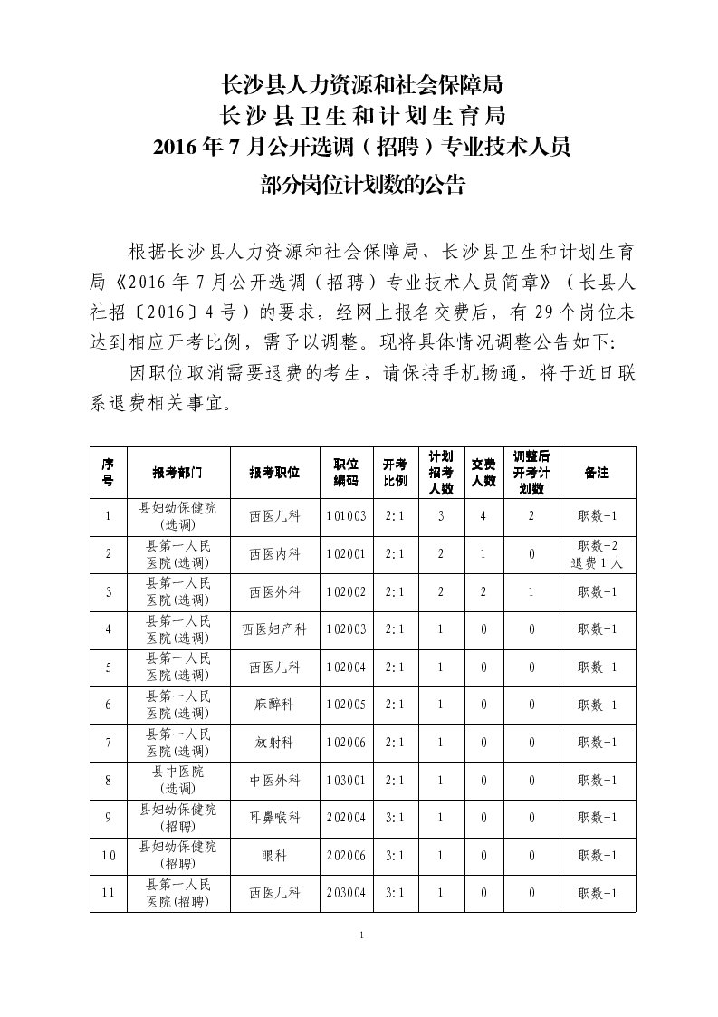 原標(biāo)題:長沙縣人力資源和社會局長沙縣衛(wèi)生和計劃生育局2016年7月公開選調(diào)(招聘)專業(yè)技術(shù)人員調(diào)整部分崗位計劃數(shù)的公告
