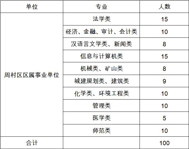 為加快實(shí)施人才強(qiáng)區(qū)戰(zhàn)略,進(jìn)一步完善我區(qū)事業(yè)單位專業(yè)技術(shù)人員、管理人員隊(duì)伍結(jié)構(gòu),干部隊(duì)伍素質(zhì)。經(jīng)周村區(qū)委、區(qū)政府研究決定,面向全國招聘100名緊缺人才到周村工作。現(xiàn)將有關(guān)事項(xiàng)公告如下: