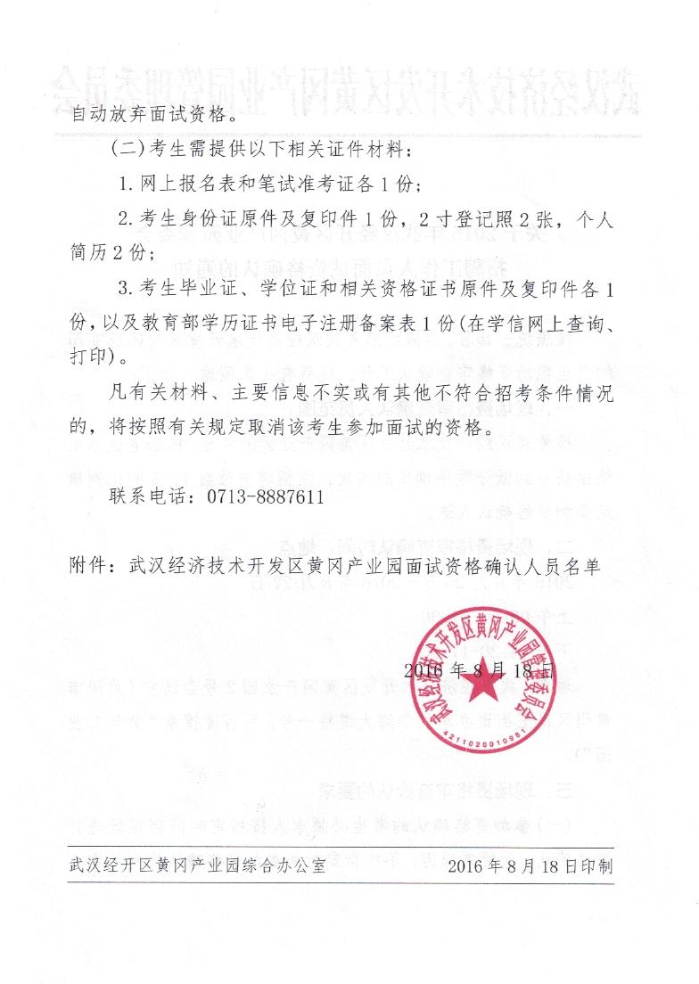 2016湖北武漢經(jīng)開區(qū)黃岡產(chǎn)業(yè)園管委會招聘面試資格確認(rèn)通知