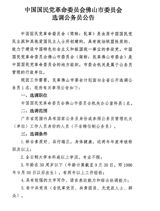 2016廣東中國國民黨革命委員會佛山市委員會選調(diào)公務(wù)員公告【招1人】