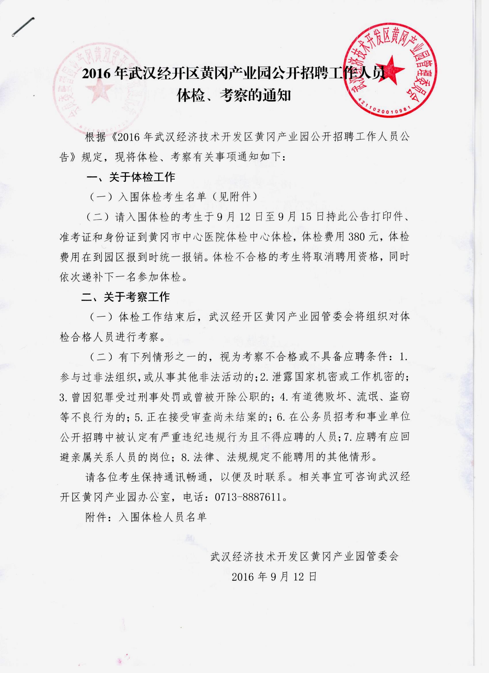 原標(biāo)題:2016年武漢經(jīng)濟(jì)開發(fā)區(qū)黃岡產(chǎn)業(yè)園管委會(huì)招聘工作人員入體檢、考察的通知