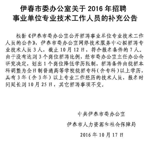 原標(biāo)題:伊春市委辦公室關(guān)于2016年招聘事業(yè)單位專業(yè)技術(shù)工作人員的補(bǔ)充公告