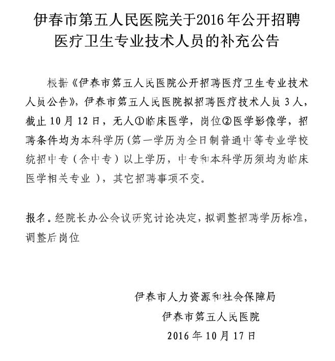 原標(biāo)題:伊春市第五人民醫(yī)院關(guān)于2016年公開招聘醫(yī)療衛(wèi)生專業(yè)技術(shù)人員的補(bǔ)充公告
