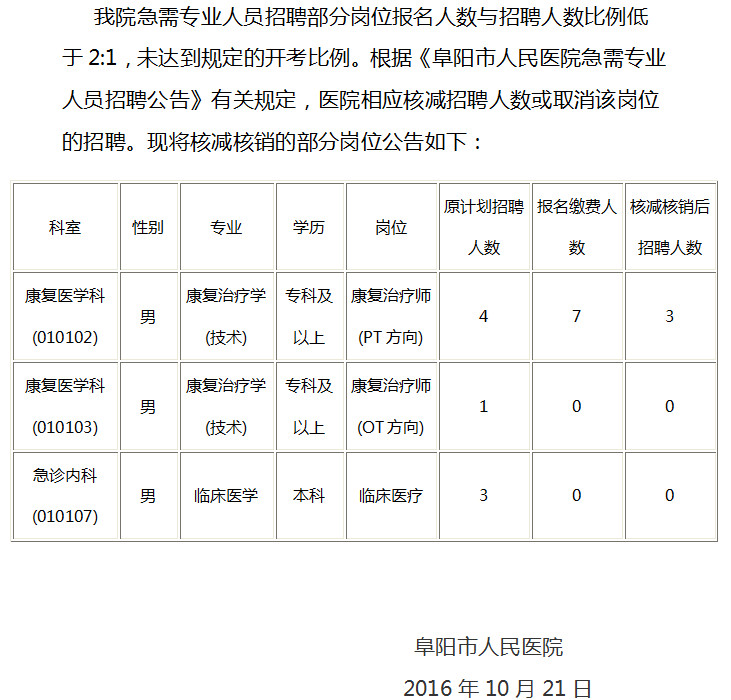 2016安徽阜陽市人民醫(yī)院急需專業(yè)人員招聘核減核銷崗位公告