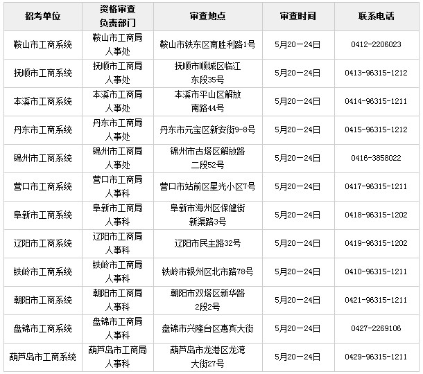 遼寧省工商系統(tǒng)(除沈陽、大連市)資格審查時間地點安排如下: