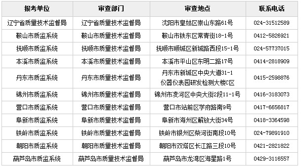 遼寧省質(zhì)監(jiān)系統(tǒng)(除沈陽、大連市)資格審查時(shí)間地點(diǎn)安排如下: