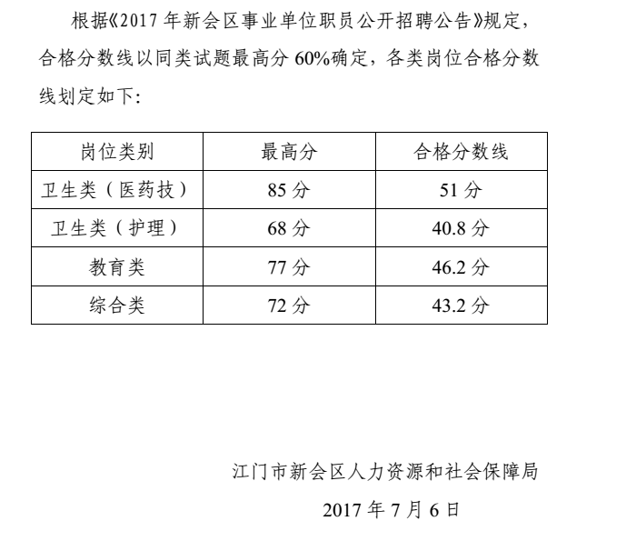 2017江門新會(huì)區(qū)事業(yè)單位職員公開(kāi)招聘筆試合格分?jǐn)?shù)線