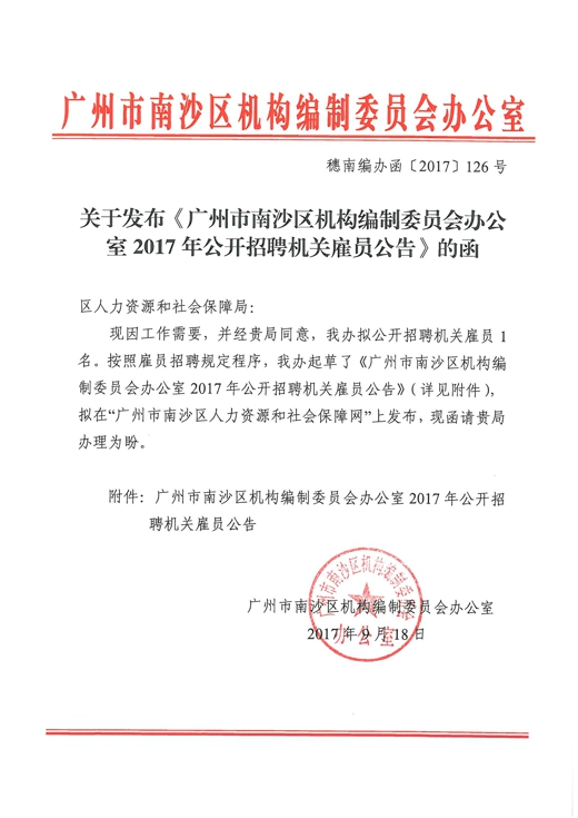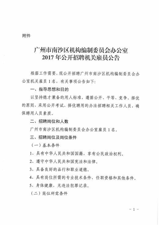 2017廣東南沙區(qū)機構(gòu)編制委員會辦公室招聘機關(guān)雇員公告【招1人】