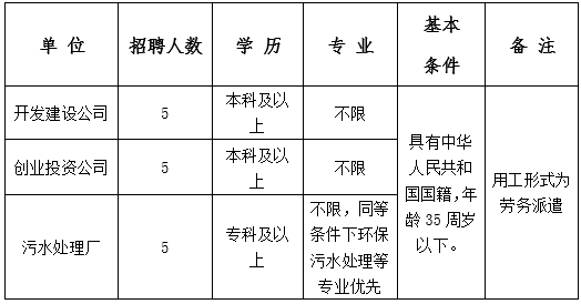 2、試用期滿合格,予以正式轉正;試用期滿不合格,予以退回勞務派遣公司。轉正后薪酬按照企業(yè)相關標準執(zhí)行:污水處理廠3000元/月起;開發(fā)建設公司和創(chuàng)業(yè)投資公司3800元/月起。